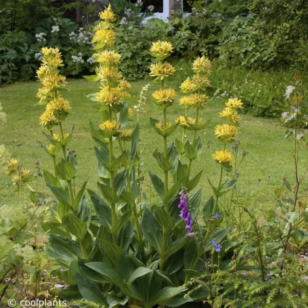 Горечавка жёлтая — мощный многолетник высотой 60-120 см с прямостоячими полыми стеблями. Цветёт в июле-августе крупными (2.5-3 см) колокольчатыми цветками ярко-жёлтого цвета, собранными в пучки по 3-10 штук в пазухах листьев. Листья широкоэллиптические, стеблеобъемлющие, длиной 10-15 см, с выраженным жилкованием. Корень стержневой, толстый, достигает 1 м в глубину. Предпочитает солнечные участки с влажными, богатыми известью почвами. Зимостойкость до -35°C. Используется в солитерных посадках, лекарственных садах и как медонос. Купить Горечавку жёлтую оптом можно в нашем питомнике.